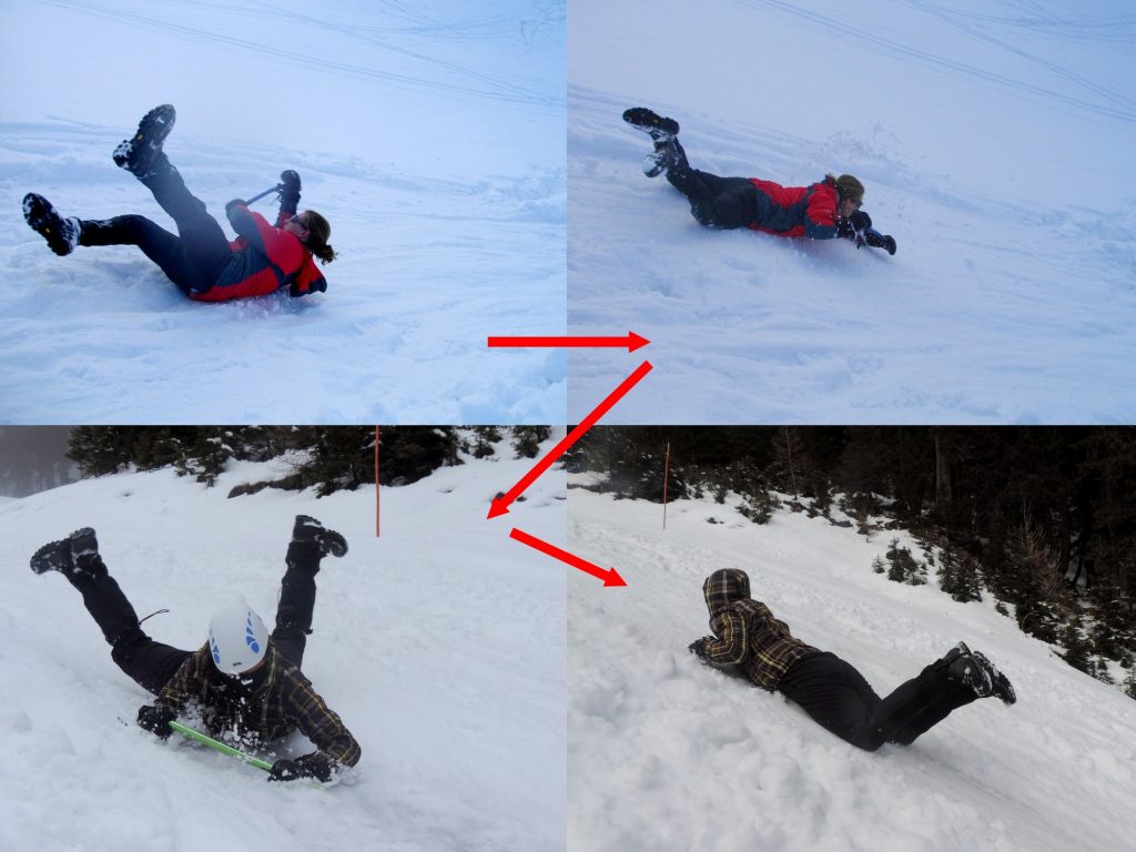 Po padcu je treba odreagirati takoj. Okel cepina zapičimo v sneg in se s celo težo naslonimo nanj. Če pademo z glavo naprej ali če drsimo s hrbtom po snegu, se moramo kar čim hitreje obrniti na trebuh. To je edini način za hitro in učinkovito zaustavitev!