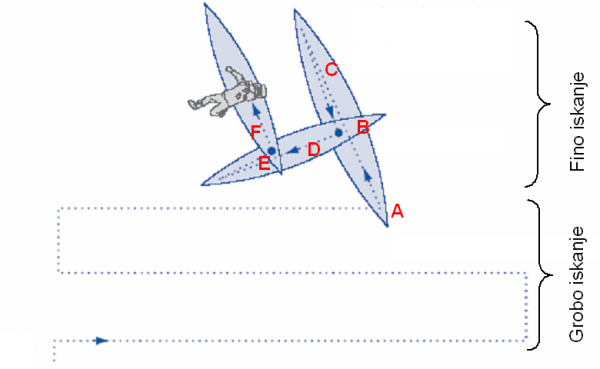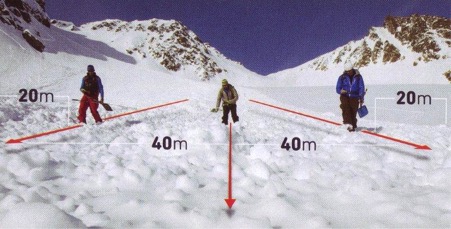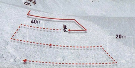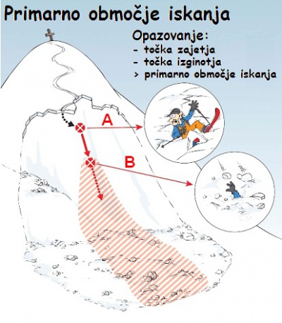 Ti točki sta pomembni zato, da si lažje predstavljamo približno smer gibanja ponesrečenega v plazu, predvsem pa, da vemo, kje začeti z iskanjem. [caption id="attachment_1931" align="aligncenter" width="400"] Pregled plazovine (A) – mesto zajetja, (B) – mesto izginotja, Šrafirano rdeče – primarno območje iskanja. Vir: Ortovox[/caption] V drugem koraku moramo poskrbeti za lastno varnost. Če nas je v skupini več, je modro določiti nekoga, ki bo območje plazu in območje nad plazom opazoval s plazovom varne točke. V primeru ponovnega proženja plazu, nas tako opozori na prihajajoči plaz. Ista oseba lahko na pomoč tudi že pokliče gorske reševalce. Šele kot tretji korak je organizacija in izvedba reševanja: 1. Pregled plazovine S pogledom hitro preiščemo plazovino, sočasno pa že začnemo z grobim iskanjem s plazovno žolno (če jo poškodovanec in mi seveda imamo). Morda poškodovani ni zasut v celoti in iz plazu gleda roka ali noga. Dobro tudi poslušamo, če bi slučajno ujeli klic poškodovanega na pomoč (sicer pa nas poškodovani pod snegom sliši precej bolje kot mi njega). Če je na površju ostal kak kos opreme, ga ne premikamo, saj lahko pomembno pomaga pri organiziranem reševanju s strani Gorske reševalne službe. 2. Iskanje s plazovno žolno Če ima poškodovani plazovno žolno, začnemo s takojšnjim iskanjem. Od mesta zadnjega vidnega stika s poškodovancem začnemo izvajati grobo iskanje signala žolne. Ko najdemo signal, sledimo magnetnim silnicam poškodovančeve žolne (fino iskanje) do točke, kjer začne signal ponovno slabeti. Na točki najmočnejšega signala nato izvedemo še točkovno iskanje s plazovno sondo. Grobo iskanje V primeru, da smo edini reševalec in da je plaz ožji od 40 m, iščemo po sredini plazovine. Pri širših plazovinah (> 40 m) en reševalec (ali dva reševalca) uporabi cik-cak tehniko, pri čemer moramo paziti, da je maksimalna razdalja med obrati 40 m (pri nekaterih žolnah celo manj – obvezno moramo prebrati navodila). Obrate lahko zaključujemo približno 20 m od roba plazovine (slika spodaj).