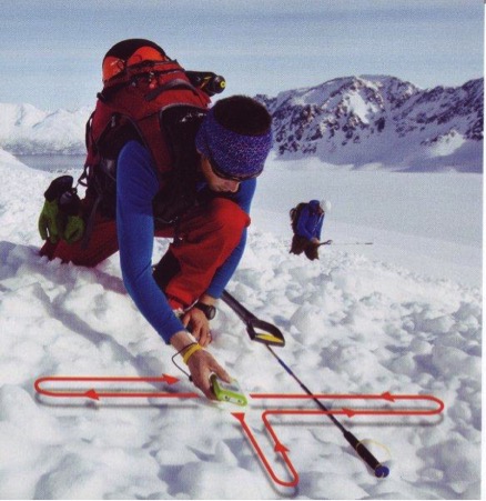 Velja za obe vrsti žoln – analogno in digitalno (obstajajo posamezne specifike – potrebno nujno prebrati navodila). Pri točkovnem iskanju smo z žolno tik nad površino snega. Žolno premikamo počasi in enakomerno v obliki križa. Žolne/roke ne obračamo – žolna naj gleda vedno v isto smer. Iščemo najmanjšo razdaljo do zasutega oziroma najmočnejši signal (skica spodaj). Ko najdemo najmanjšo razdaljo, jo označimo (npr. z rokavico) in pričnemo s sondiranjem. Pri točkovnem iskanju ne izgubljamo časa z iskanjem najmanjše razdalje, ki jo lahko prikaže žolna. Nekako v območju najmanjše razdalje, začnemo s sondiranjem, saj je veliko hitrejše kot točkovno iskanje. 3. Sondiranje Sondiramo vedno v rokavicah, sondo držimo z obema rokama. Sondiramo pravokotno na površino in ne vertikalno (skica spodaj). Žolna nas namreč pripelje do najmanjše razdalje, kar pa ni nujno, da je ta neposredno nad zasutim.