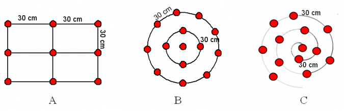 Različni načini sondiranja (A) v kvadratu, (B) v krogu, (C) v polžu.