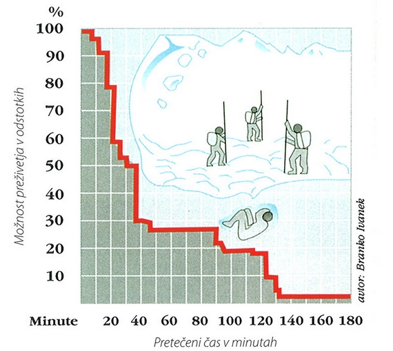 Raziskave in izkušnje pravijo, da je možnost preživetja zasutega po 15 minutah po zasutju skoraj 92 %. Nato začne krivulja preživetja strmo padati in po dveh urah od zasutja preživi le še 15 % poškodovancev. Vzrok smrti je največkrat zadušitev, zato je izdelava čim večjega zračnega žepa ključna. Na drugem mestu med vzroki za smrt so poškodbe, ki že takoj ali nekoliko kasneje privedejo do stanj nezdružljivih z življenjem (zlomi, krvavitve, poškodbe glave …). Podhladitev je šele na tretjem mestu, vseeno pa moramo prav zato nevarno območje prečiti ustrezno oblečeni. https://www.youtube.com/watch?v=RnCCqHOiX5Q