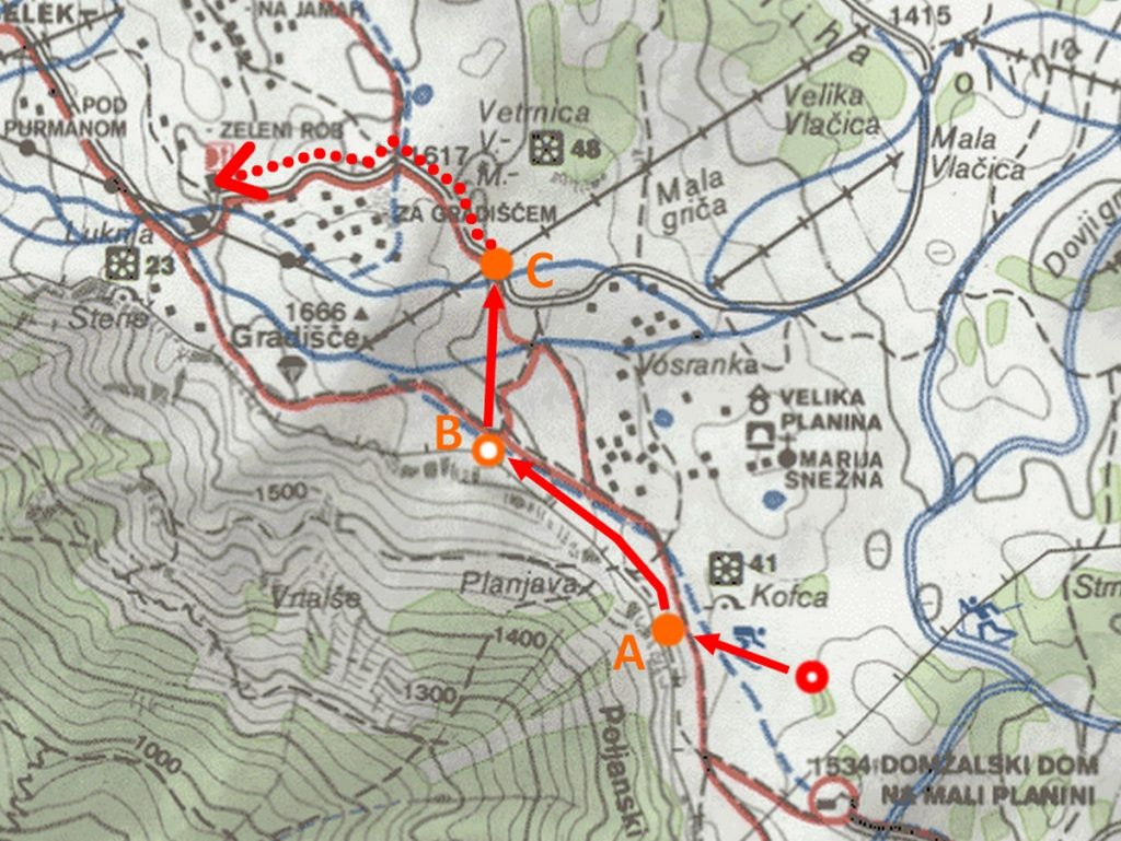 - Ko ugotovimo, da nismo več na pravi poti, da smo se izgubili, najprej poskrbimo za našo varnost. Po potrebi se umaknemo iz prepadnih območij, nadenemo čelado in najdemo primeren teren, na katerem preučimo situacijo in nadaljnje korake.